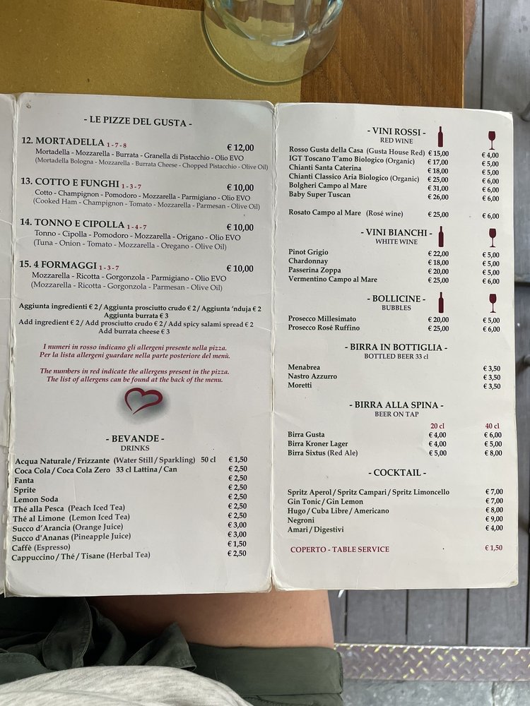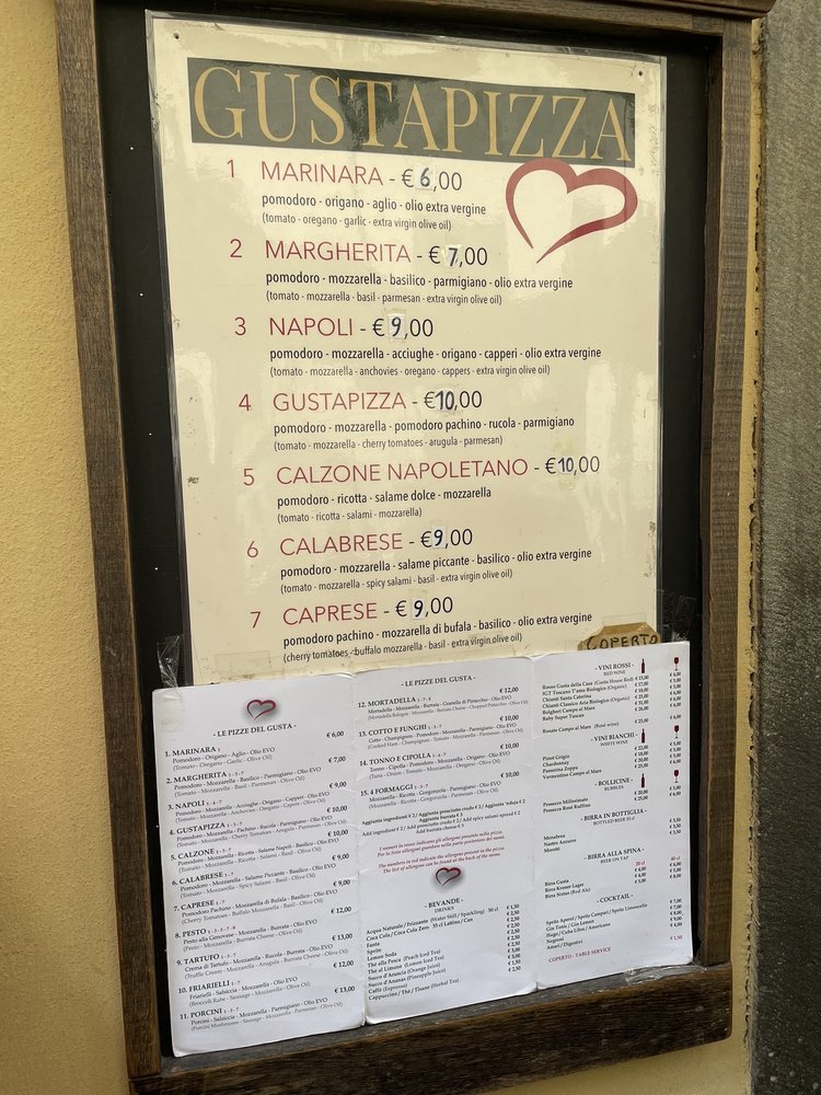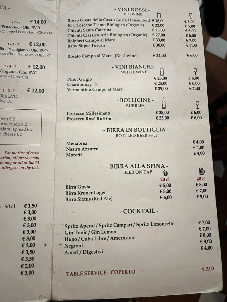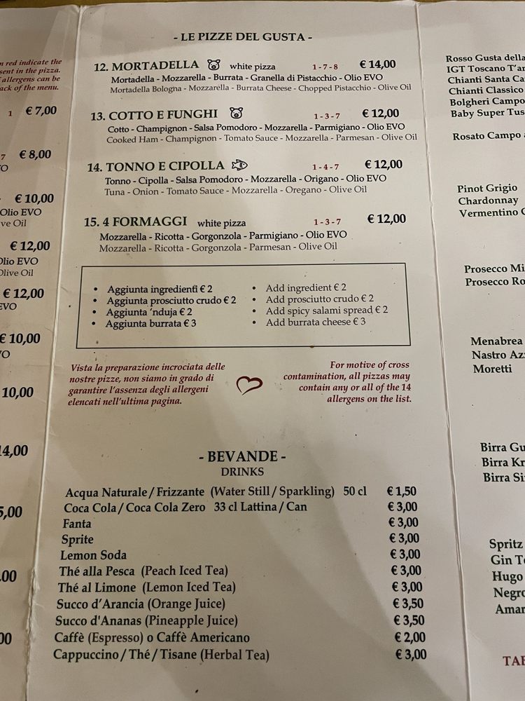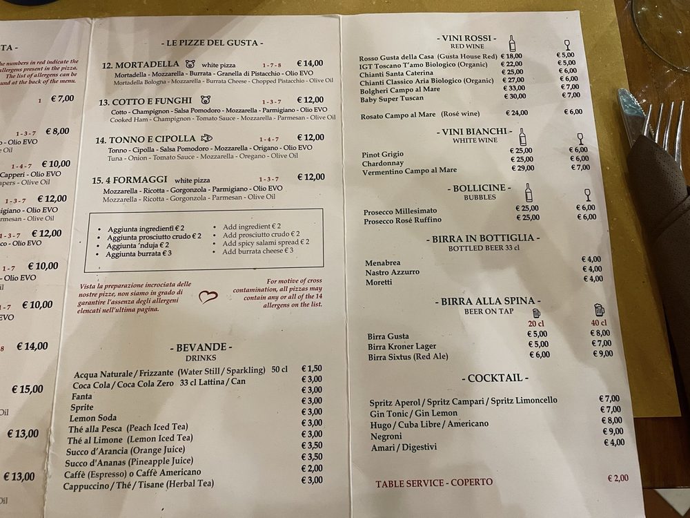“ I'm glad I was able to try Gustapizza! It was a nice treat and good experience. Around 1:30 PM, other restaurants were beginning to close, so we wandered over here. There was a line forming along the wall, but we were seated within 15-20 minutes. Between four people, we shared three pizzas and had about 7 slices leftover. They gave us a box for the leftover slices. Gustapizza €12 - This was my favorite! It had fresh arugula on top. The tomatoes were so good. I loved the tomato sauce. Porcini €13 - This was good only because of the sausage. I didn't like how mushy the mushroom was. Cotto e funghi €12 - This was the second best of the three. This also had tomato sauce. The ham and mushroom were good. The table next to us ordered the truffle pizza €15; it smelled so good. I would try that next time. Credit card/Apple Pay accepted. Pay at cashier. Bathroom is downstairs. No WiFi. Menu is in English. Cover charge €2 per person. ”