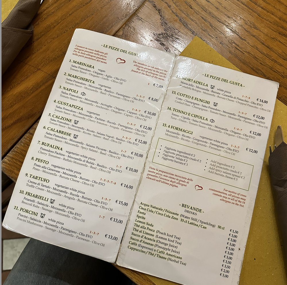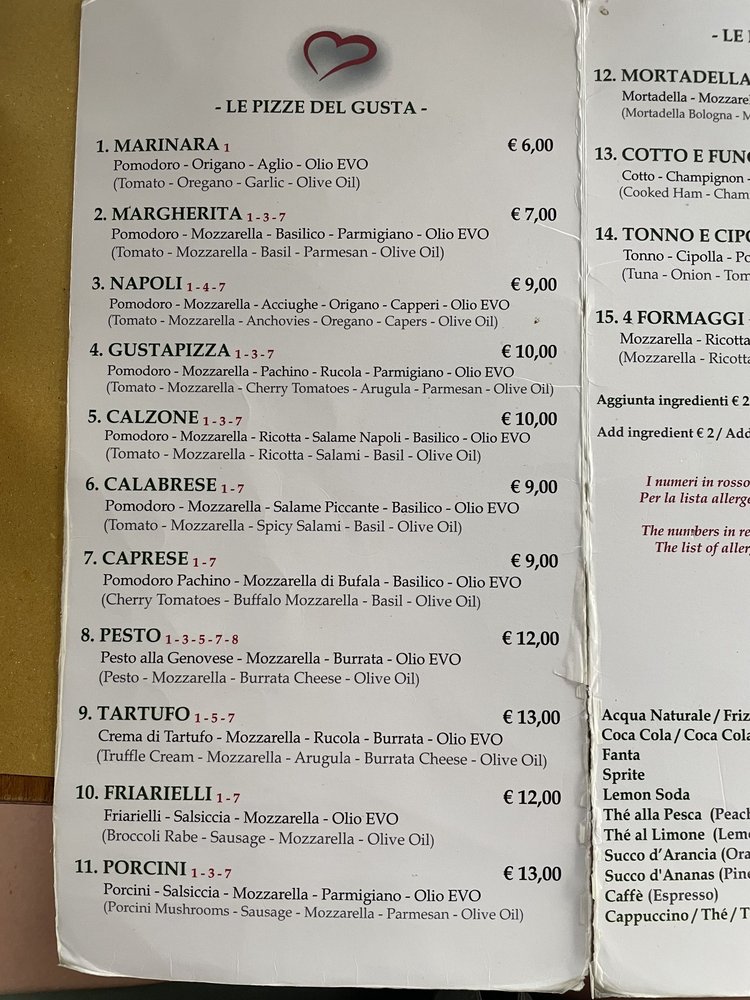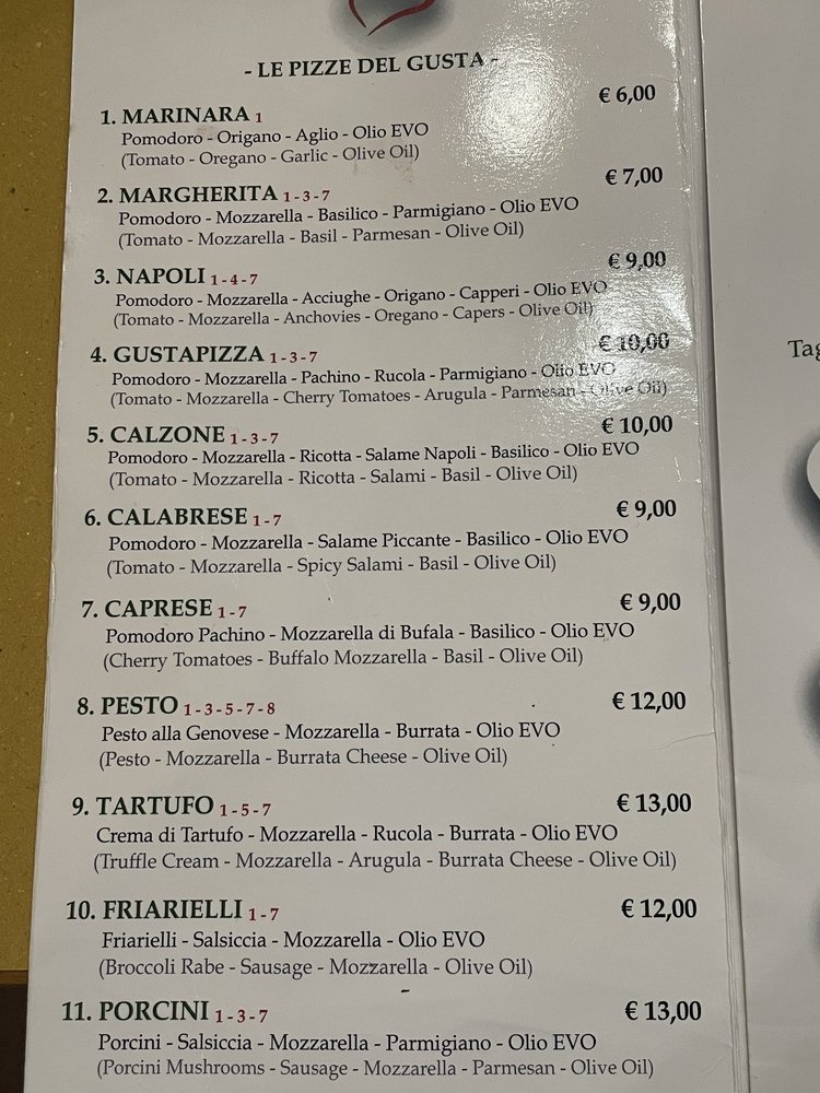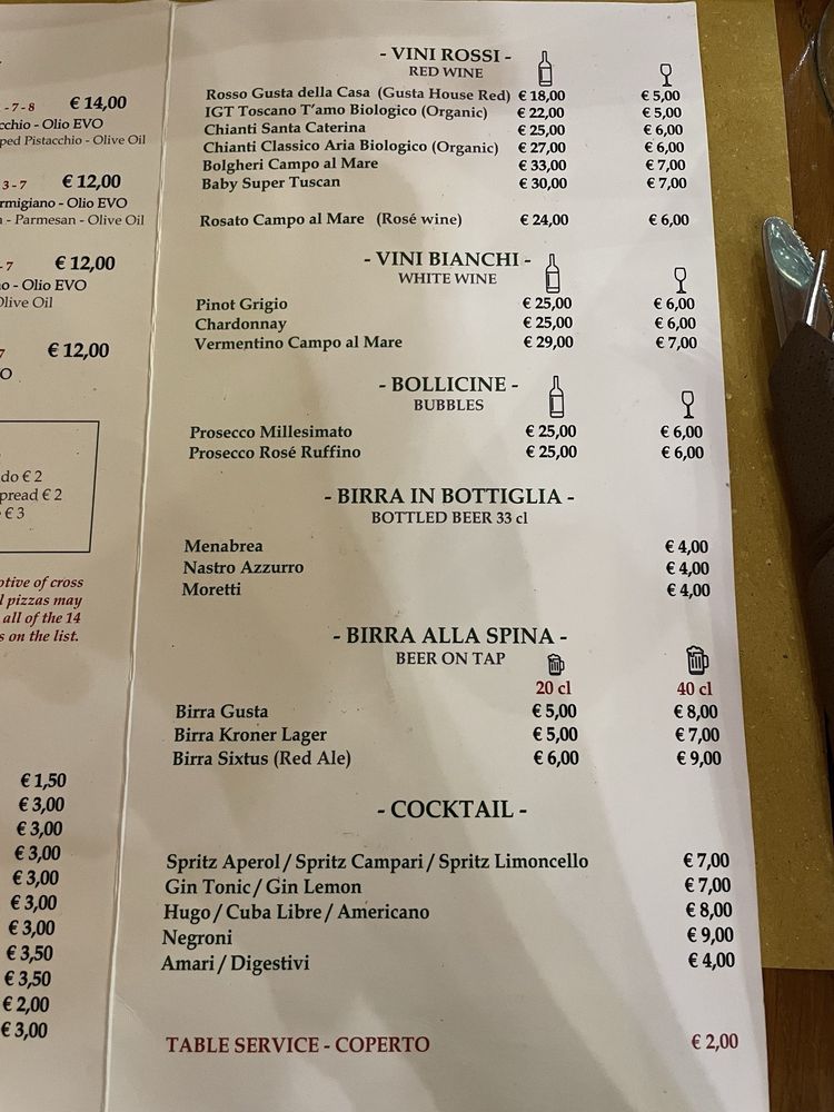 “ I'm glad I was able to try Gustapizza! It was a nice treat and good experience. Around 1:30 PM, other restaurants were beginning to close, so we wandered over here. There was a line forming along the wall, but we were seated within 15-20 minutes. Between four people, we shared three pizzas and had about 7 slices leftover. They gave us a box for the leftover slices. Gustapizza €12 - This was my favorite! It had fresh arugula on top. The tomatoes were so good. I loved the tomato sauce. Porcini €13 - This was good only because of the sausage. I didn't like how mushy the mushroom was. Cotto e funghi €12 - This was the second best of the three. This also had tomato sauce. The ham and mushroom were good. The table next to us ordered the truffle pizza €15; it smelled so good. I would try that next time. Credit card/Apple Pay accepted. Pay at cashier. Bathroom is downstairs. No WiFi. Menu is in English. Cover charge €2 per person. ”