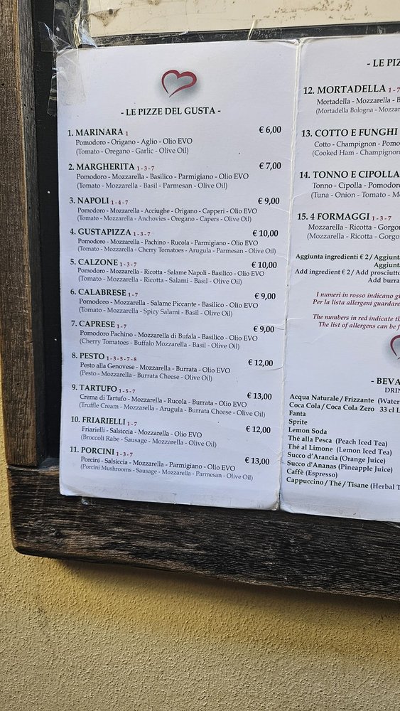 “ Gusta Pizza is the best pizza in Florence. It may seem touristy on the surface, but it is not. The employees are all very friendly, and the food is incredible. The tomato's taste freshly picked. The pesto pizza is INSANE. One of a kind. We ended up going twice and my girlfriend made sure of it. We will be back, mark my words Gusta Pizza. ”